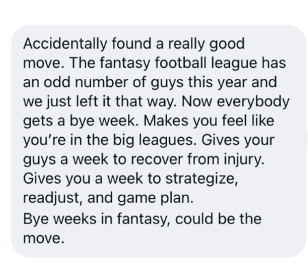 Love this. Personally, I’d also advocate for a bye week from life in general. Everyone needs some time to hit the reset button, catch up on some sleep, go back and study tape from the year. Let’s get the ball rolling on that one once you’re back in session, government.